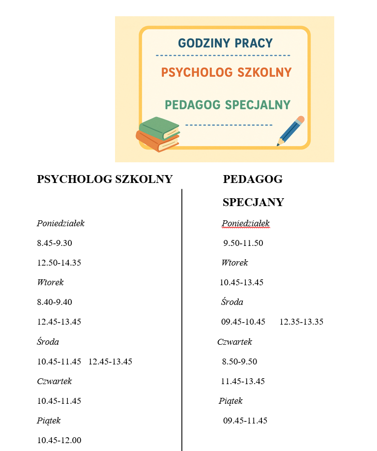 Harmonogram pracy psychologa i pedagoga specjalnego dostępny jest w zakładce z godzinami pracy oraz na tablicy informacyjnej w szkole.