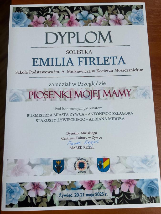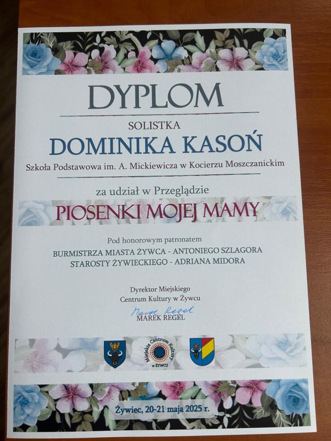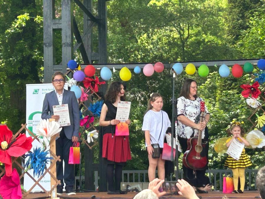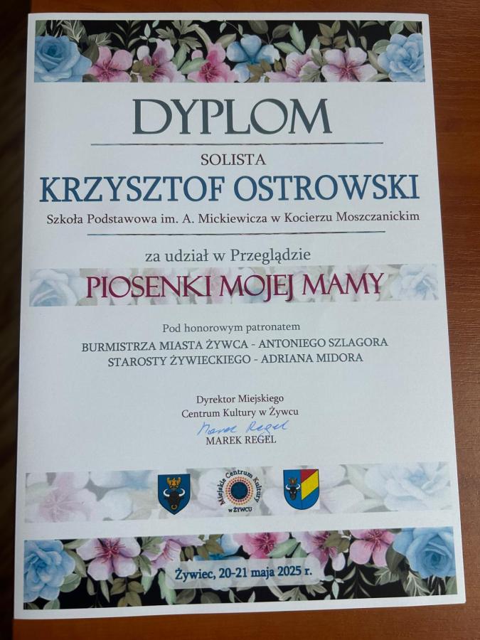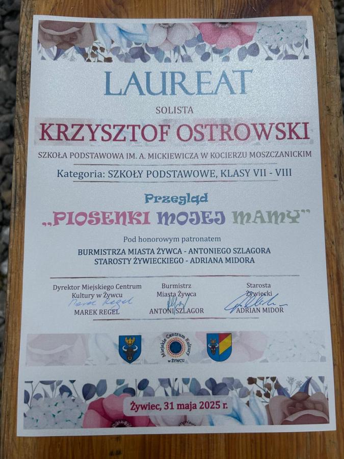 Uczniowie naszej szkoły Dominika Kasoń, Emilia Firleta i Krzysztof Ostrowski wzięli udział w konkursie wokalnym „Piosenki mojej mamy”, który odbył się w Miejskim Centrum Kultury w Żywcu. Krzysztof Ostrowski uczeń klasy 8 został laureatem tego konkursu i wystąpił na Koncercie Laureatów , który odbył się w Amfiteatrze Pod Grojcem w Żywcu . Krzysztofowi gratulujemy sukcesu , a wszystkim wykonawcom życzymy kolejnych udanych występów.