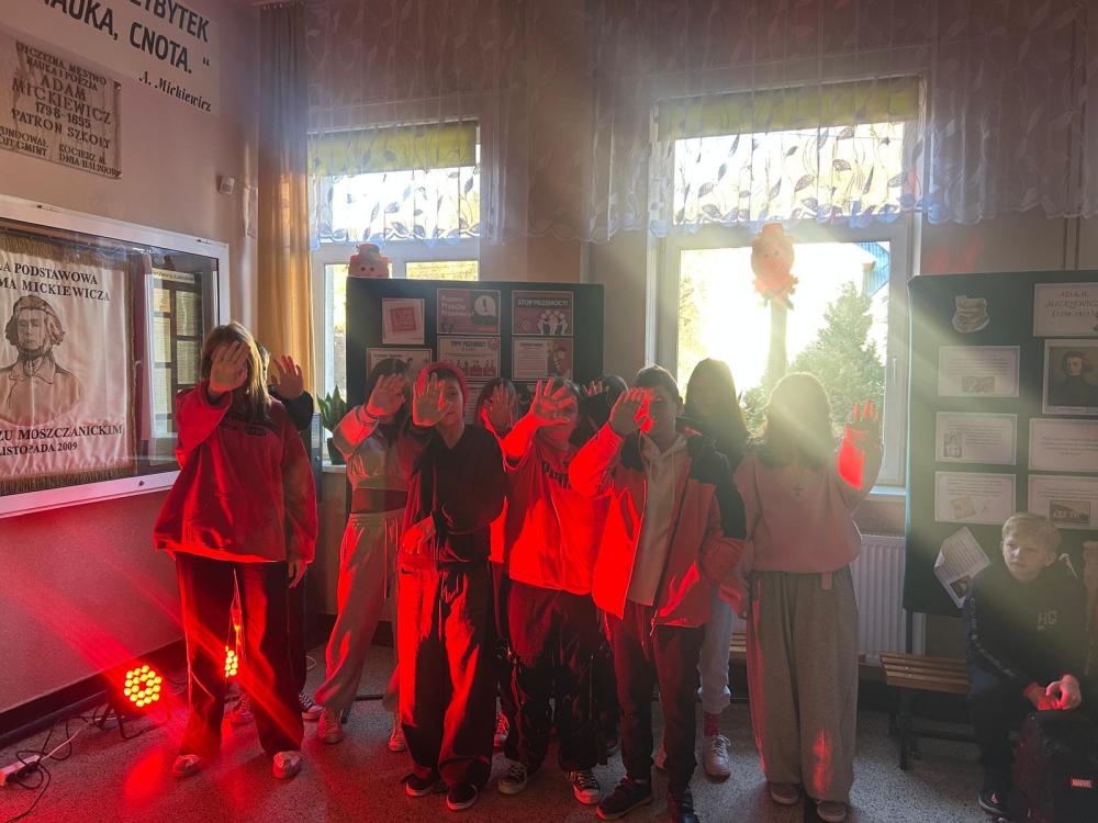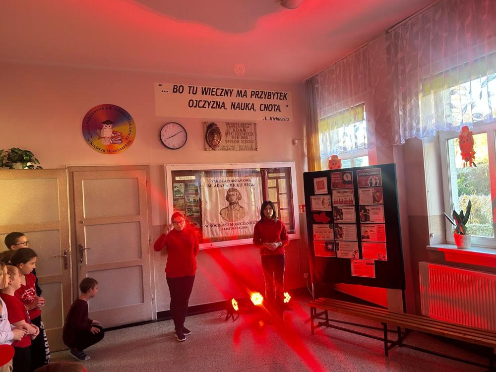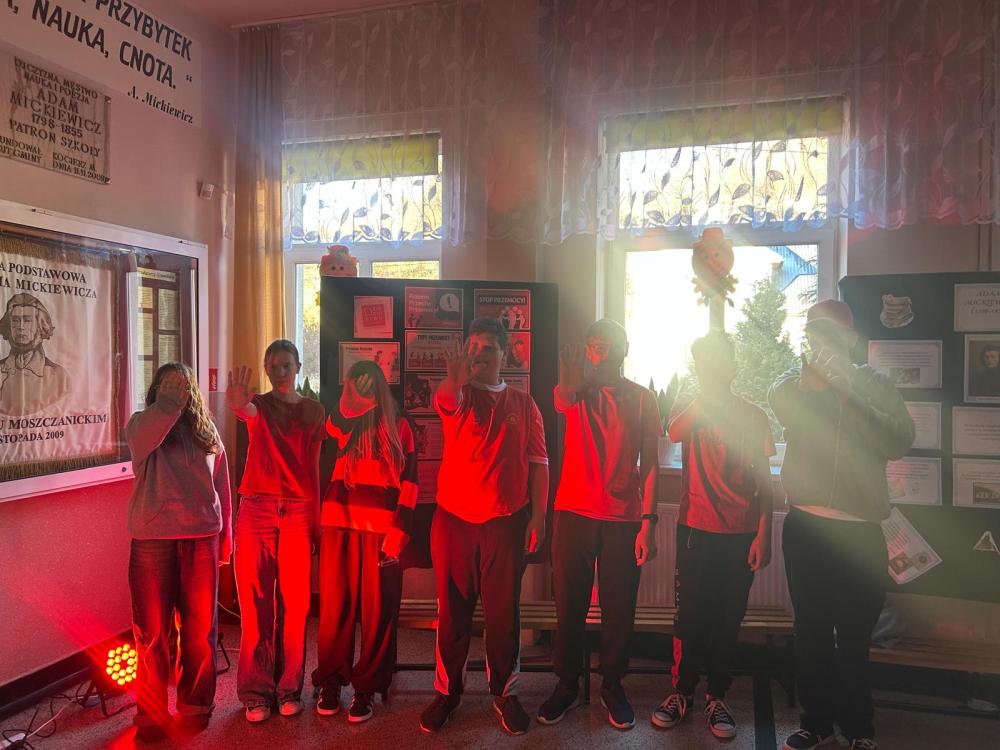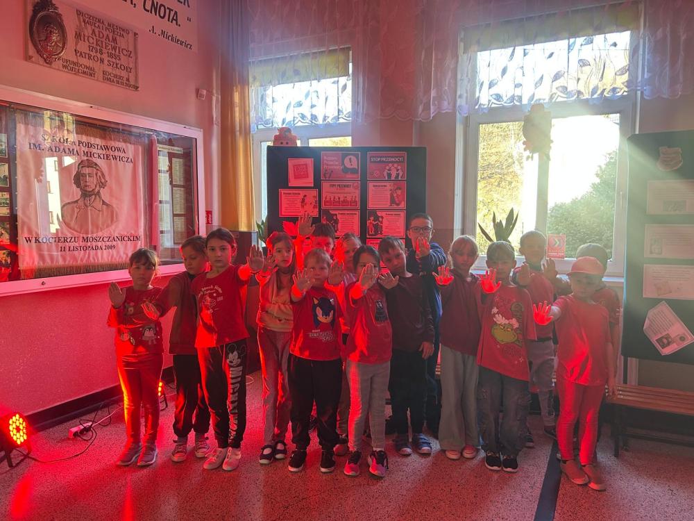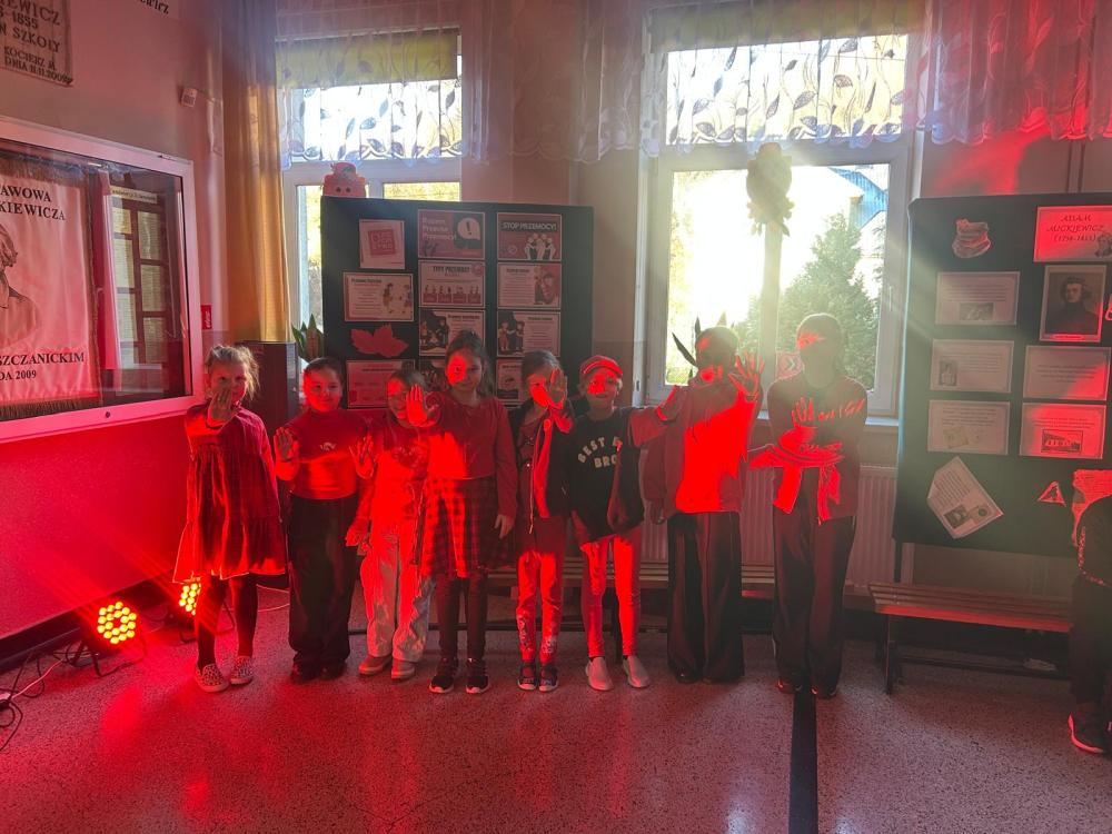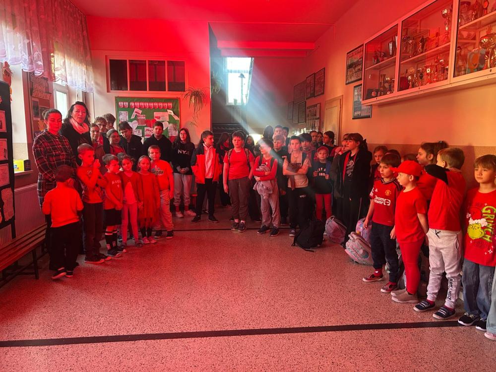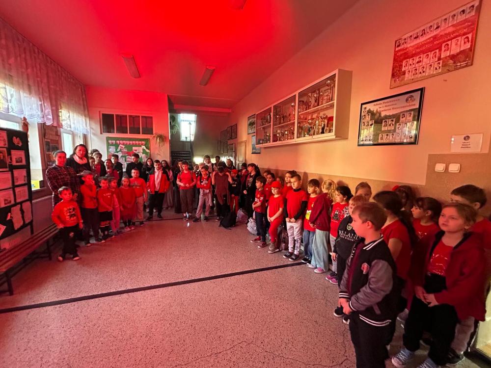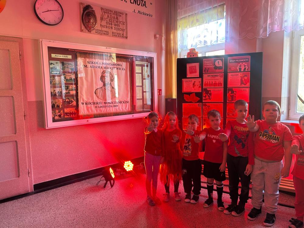 Na zakończenie wydarzenia nasz korytarz zabłysnął na czerwono, symbolizując jedność oraz gotowość do przeciwstawiania się przemocy i hejtowi.