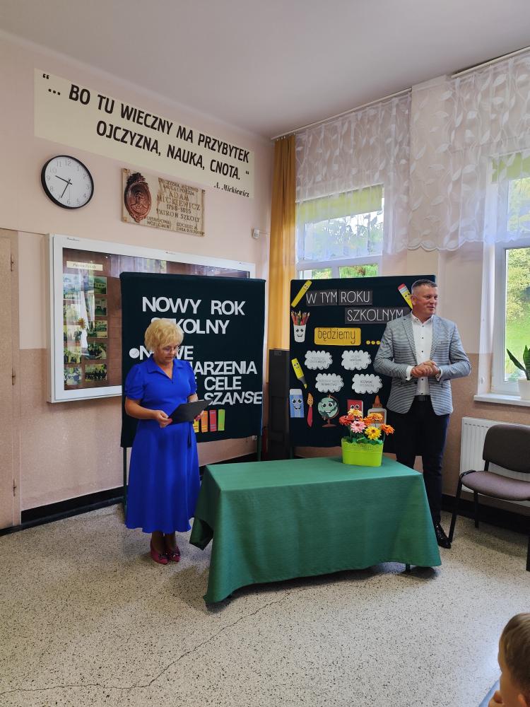 Wśród gości obecny był również Pan Wójt, który złożył uczniom życzenia wytrwałości, sukcesów i wielu niezapomnianych chwil w nowym roku szkolnym. Zaznaczył, że edukacja to nie tylko zdobywanie wiedzy, ale także budowanie wspólnoty opartej na wzajemnym szacunku i odpowiedzialności.